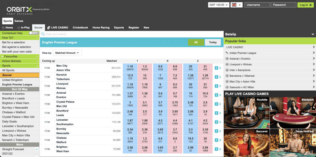 Orbit Exchange is very much identical to the Betfair Exchange. From the left menu after signing in, you can choose from a number of sports. After selecting a sport, you can either see upcoming/live matches or use the specialized search option to find a match.
