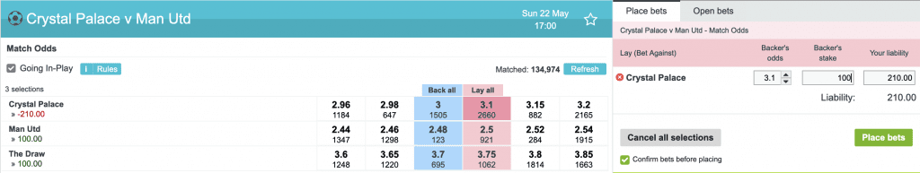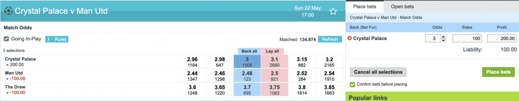 For both back bets and lay bets, the bets must be put by clicking the 'Place bets' option. If you want to double-check your bets before placing them, click the option 'Confirm bets before placing.' If you don't check that box, your bets will be placed immediately when another punter agrees to back or lay your wager.