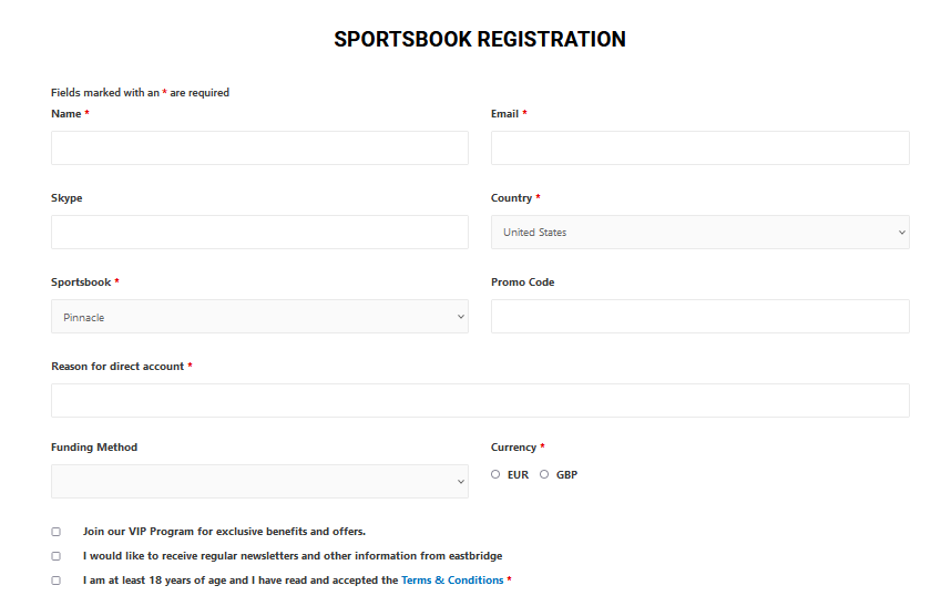 Pinnacle, also known as PS3838, was created in 1998 and has since grown to become one of the most well-known sports betting companies in the world. It is located on the island of Curacao and is licensed by the Netherlands Antilles Gaming Commission. Due to its small margin, it offers excellent odds, which is crucial for all expert punters. It used to provide online poker alongside sports betting in 2008, but stopped doing so in 2011 due to some changes in European gambling rules. When the Unlawful Internet Gambling Enforcement Act (UIGEA) was passed on January 11, 2007, it left the United States. In 2010, it was one of the first bookies in the world to provide eSports betting, and in 2016, it was the first to offer drone racing odds. It does not provide new users with any sign-up bonuses, but it does provide a fair betting line.To open a direct account with Pinnacle via Eastbridge, go to https://eastbridge-sb.com/register/ and fill out your personal information such as name, email, Skype, country, and so on, before selecting Pinnacle as the sportsbook. Then, write a reason for your request to create a direct account for Pinnacle. If you have any promotional offers to avail, then enter the promo code and select your preferred currency between EUR and GBP. Finally, select a funding method from the dropdown list and click on the Submit button. The Eastbridge support team will send you an email with the username and password for the Pinnacle (PS3838) betting platform. Users can log into the PS3838 platform by using their login credentials and then change the password by clicking on Account > Password. Create your Eastbridge account here!