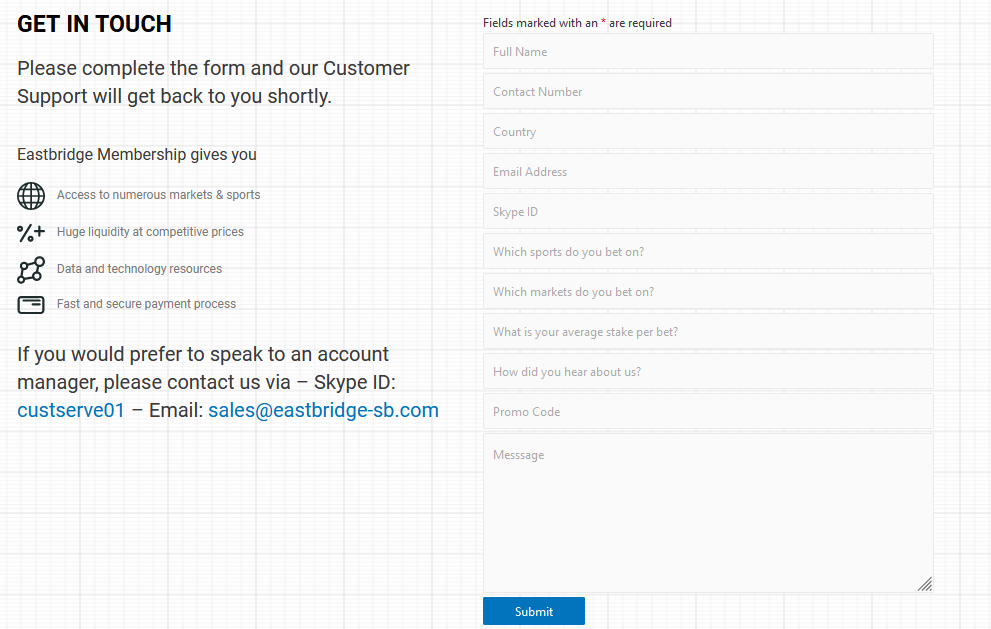 Eastbridge's website is adaptable and works well on both desktop and mobile devices. It offers an optimized and simple interface for punters on the go who utilize mobile devices. Customers receive highly competent and always confidential account management services from industry experts with unparalleled experience. Eastbridge does not currently provide any bonuses or offers. However, their partner sportsbooks and trading platforms provide several promotions that users can take advantage of by using this brokerage. Create your Eastbridge account here!Customer Support