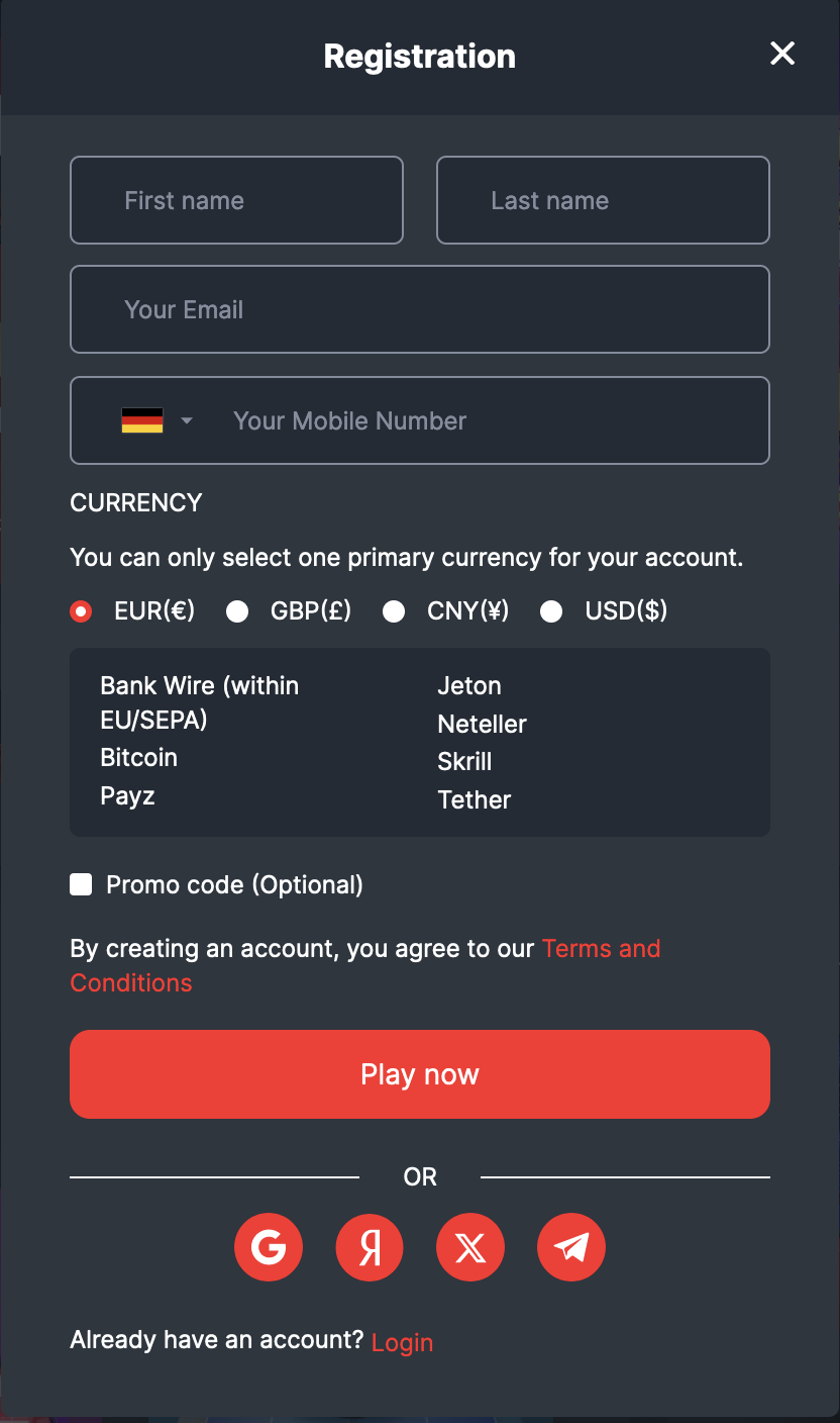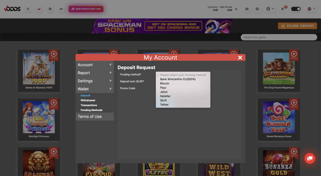 When logging in for the first time, you will be met with a deposit screen. You can choose between bank transfer, crypto and ewallets, so there is always a method available for most users.