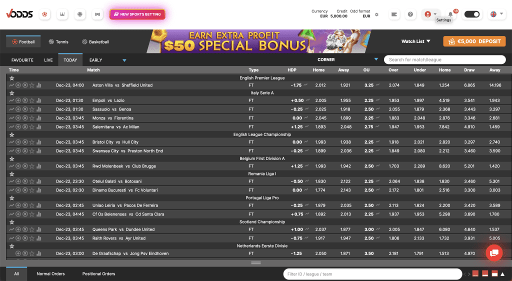 The VOdds sporting platform has some advanced functions which can’t be seen in the traditional broker platforms. While it may appear complicated at first, the VOdds platform’s interface is surprisingly simple to grasp. It has a classic design and a new design, which will be set permanently after some days, when the classic design won’t be available on the platform. Currently, users can switch between both of the interface designs, and a tutorial is shown every time with the introduction of all the features. However, it can be skipped at any time.At the very top of the interface, a credit bar with an overview of the financial status of the account is displayed. It shows the available credit, accumulated profit or loss, the odd format, etc.VOdds only covers three sports, and there are three icons on the top left corner for football, tennis, and basketball. The events and markets of the specific sport will be displayed based on the selection. Right under the sports icon, there are some tabs named as “Favorite”, “Live”, “Today”, and “Early”, which will show the user’s favorite matches, in-play matches, current day matches, and future scheduled events, respectively.