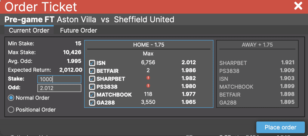 Placing a bet operates the same way it does with any other bookmaker; simply click on an odd and a popup bet slip (also known as an order ticket) appears. The best odds offered by the bookmakers will be displayed with both home and away option in Current order. Minimum and maximum stakes are also shown and user have to enter the desired stake and odd to place the order. The best thing of VOdds is the Future order which can be used to run order with best effort if the current order expires. The order will be showed at the bottom of the list of orders after confirming the selection.