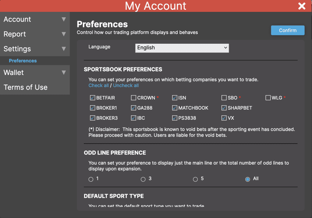 Another useful feature is the ability to choose from a variety of closure alternatives for positioning orders. Users can choose to close at best effort (the best market price available at closing) or to ensure a minimum odd/UPL (selecting this option ensures that an order will be closed at an odd/profit or loss amount equal to or greater than the given). This increases bettors’ profitability and provides them with more control with less effort.Plenty of leagues are available for the three sports of football, tennis, and basketball on this platform. There are also markets such as Asian Handicap, Over, and Under available, as well as betting opportunities in Corner, Special, Full Time, and Half Time. Odds formats are also limited on this platform, including Europe and Hong Kong. The interface can be seen in both dark and light themes.